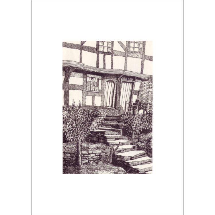 Pen and ink drawing of Tudor cottage steps.